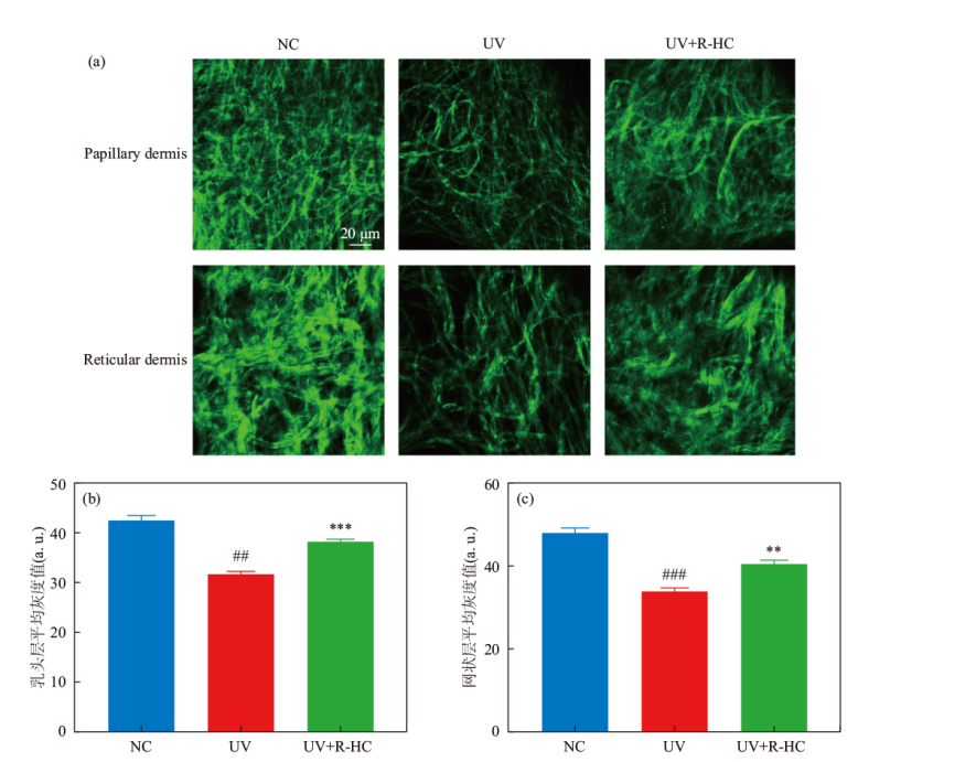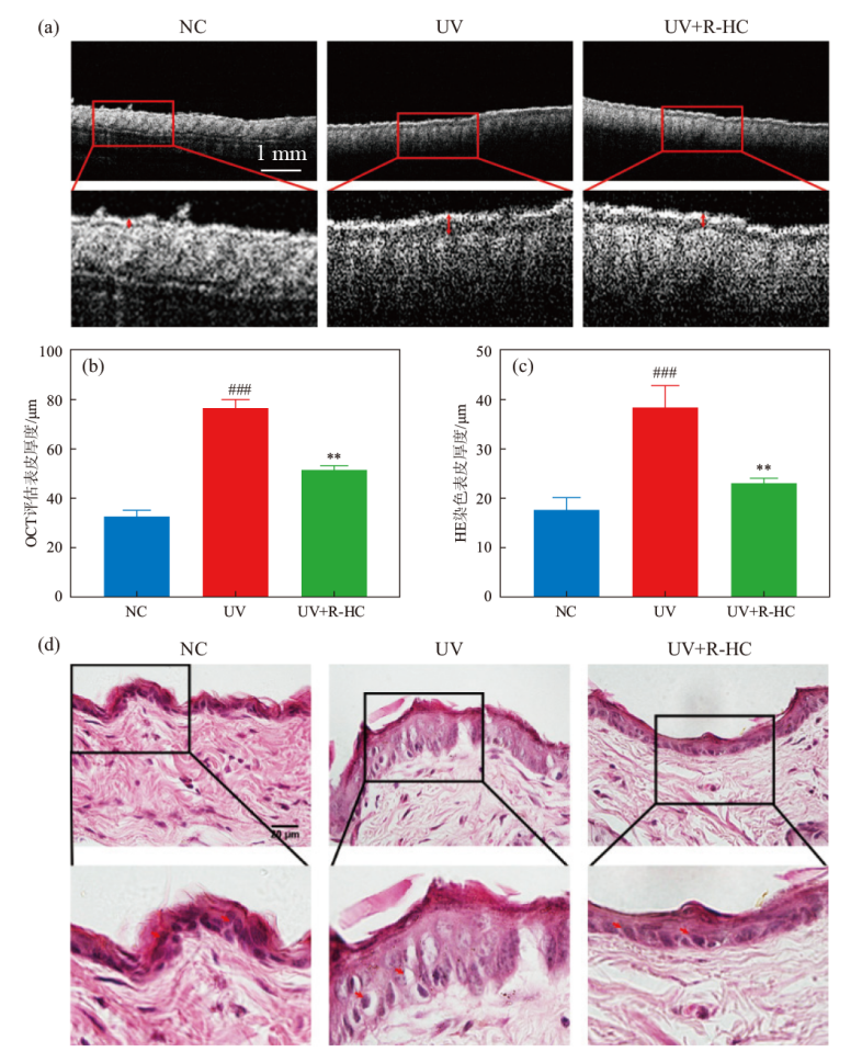 研究重组人源胶原蛋白(recombinant human collagen,R-HC)对UV诱导小鼠皮肤光老化的改善作用。通过建立UVA和UVB照射的光老化小鼠模型,采用C-Cube多功能皮肤成像分析系统、光学相干断层成像和HE染色等手段,系统评估皮肤皱纹和表皮厚度的变化。双光子激发荧光成像技术和液晶偏光影像技术检测真皮胶原纤维的改变。同时,利用Gomori醛品红法和RT-qPCR技术分别检测弹性纤维的形态变化及细胞外基质金属蛋白酶的表达。研究结果显示,R-HC能够显著减轻光老化小鼠皮肤的皱纹,提高角质层及表皮的含水量,并降低表皮厚度。此外,R-HC还能改善光老化小鼠皮肤中胶原纤维含量的降低和排列的紊乱,降低弹性纤维的断裂和增粗,并调控细胞外基质金属蛋白酶-3和基质金属蛋白酶组织抑制剂-1 mRNA的相对表达量。综上所述,R-HC可以改善UV诱导的皮肤光老化,在光老化皮肤改善产品的开发中具有重要的应用价值。