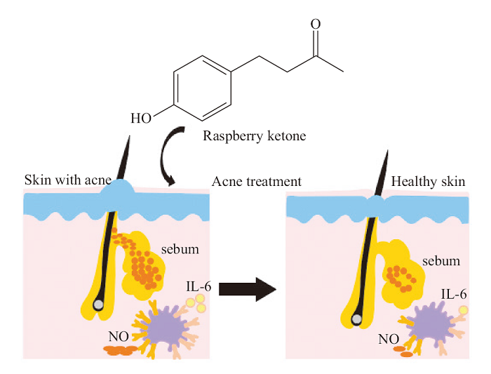 Raspberry ketone (RK), a common ingredient in cosmetics, possesses antioxidant, preservative, and skin-whitening properties. However, the action mechanism of RK in the treatment of acne remains unclear. Therefore, the study evaluated the sebum-controlling and soothing efficacy of RK by establishing celluar models of lipid synthesis and inflammation in vitro. Additionally, a human efficacy testing on the acne-alleviating effects of RK was conducted. The results indicate that both low-dose (4 μg/mL) and high-dose (40 μg/mL) RK significantly decrease the synthesis of neutral and polar lipids. While the low concentration of RK at 4 μg/mL does not inhibit the secretion of interleukin-6 (IL-6) and nitric oxide (NO), the high concentration of 40 μg/mL significantly inhibits their expression with the inhibition rates of 39.5% and 20.7%, respectively. Additionally, compared with 100 μg/mL dexamethasone sodium phosphate (positive control group), RK at this concentration shows no significant difference in its inhibitory effect on NO secretion. In a trial involving volunteers who meet the inclusion criteria, after consecutively using cream samples containing 0.5% RK for 14 days, all participants report no adverse skin reactions. Notably, their sebum and porphyrin contents decrease by 23.0% and 22.5%, respectively. Furthermore, the lactic acid sting score, erythema index (EI) value, a* value in the red area, and red area size decrease by 48.8%, 6.1%, 11.3%, and 41.8%, respectively. The lesion regression rates for comedones, papules, and pustules are also reconfirmed at 33.8%, 41.8%, and 57.1%, respectively. Additionally, the height and volume of acne lesions decrease by 46.2% and 63.2%, respectively. The study demonstrates that RK exhibits sebum-controlling, soothing, and acne-reducing properties.
